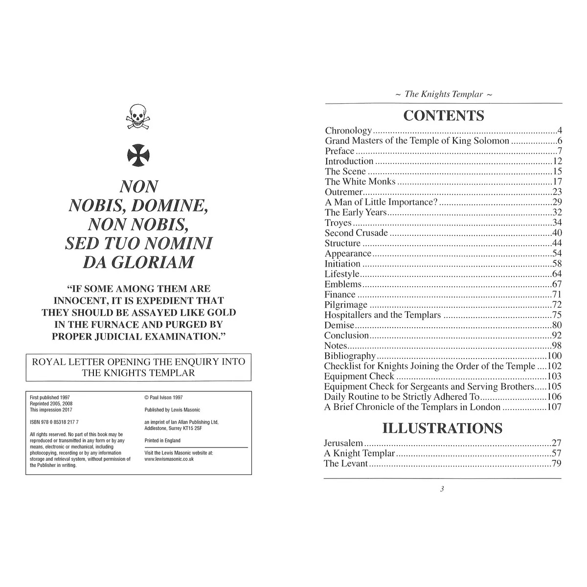 This is a comprehensive pocket book covering the origins, structure, appearance, clothing, territory, emblems and even the lifestyle of the Knights Templar. It includes many illustrations, a complete list of the Grand Masters or the order, charts of chronology of key events and even a set of check lists that were used by the Templars themselves.