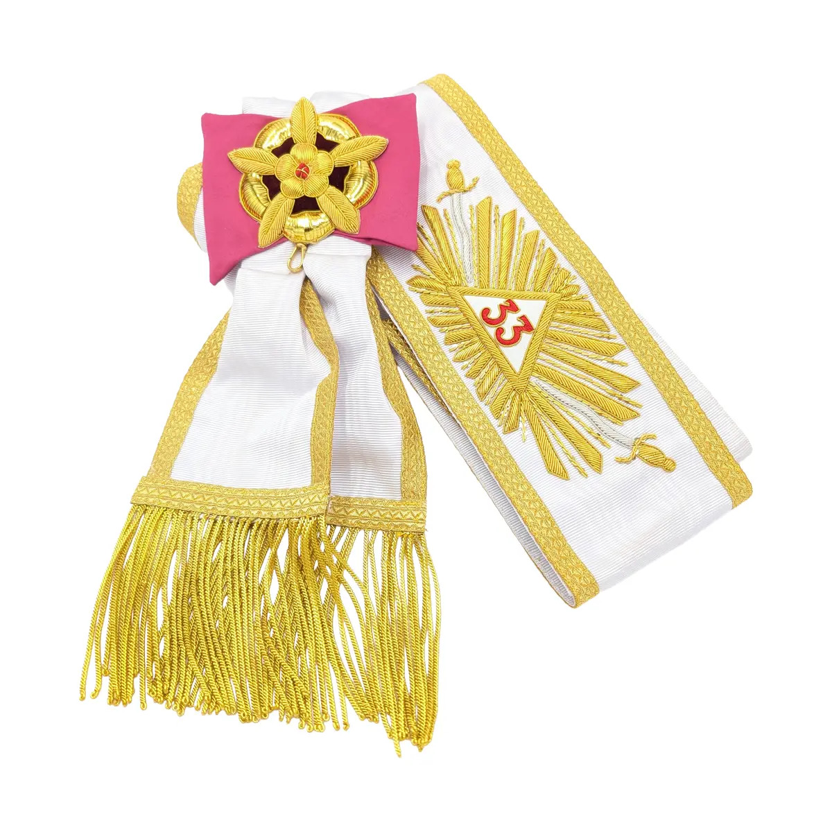 A beautifully crafted Rose Croix 33rd Degree Sash, hand-embroidered with exceptional attention to detail. This sash is made from elegant white moiré watermarked ribbon and adorned with golden braid along the borders, finished with a 4-inch gold bullion fringe for a distinguished and ceremonial look.
